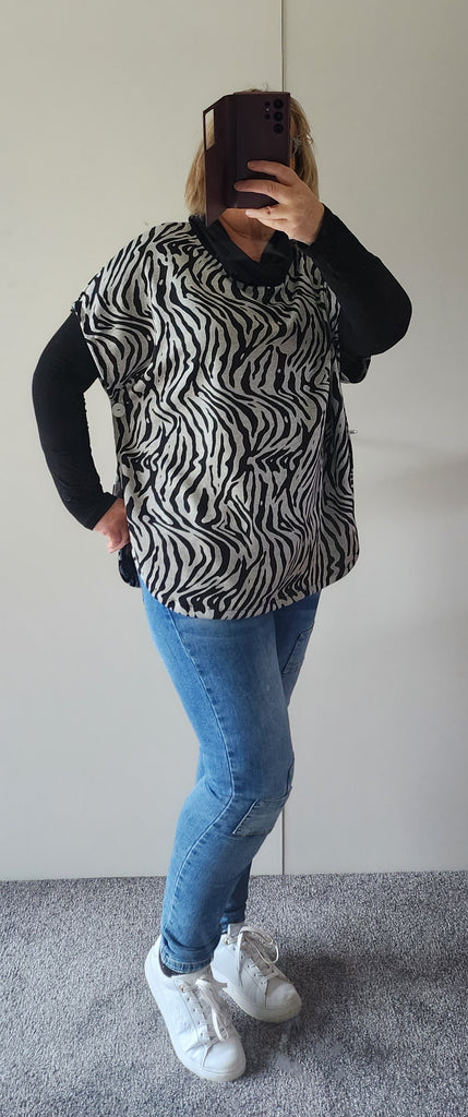 The back sits a bit longer than the front - big button detail forms a sleeve, fabric is a Ponte - cotton polyester viscose mix