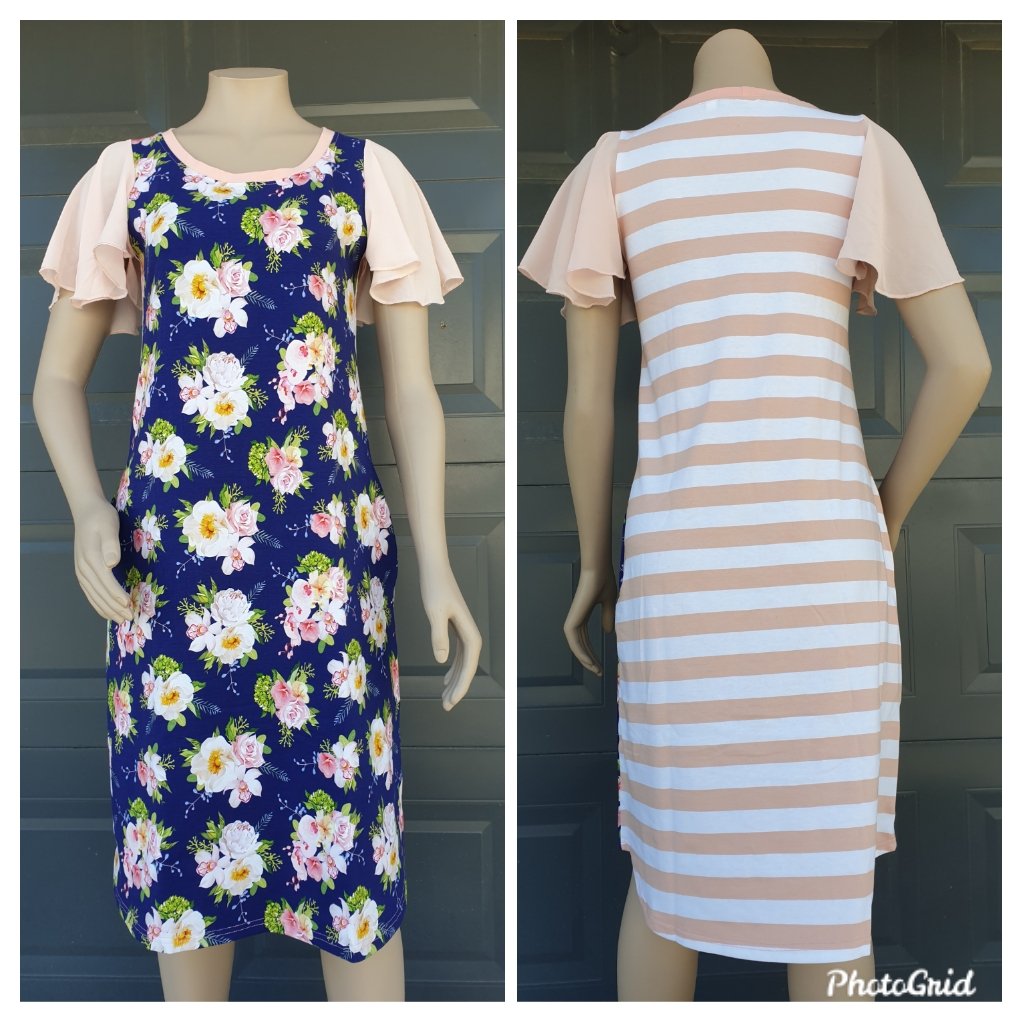 Cotton / Spandex, This one has pockets at the hips. Style is A Line , fitted at the bust and v's down over the hips
