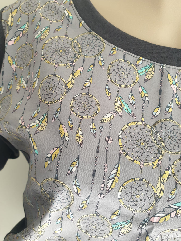 Merino Jumper with Cotton Print Front - back and sleeves are 100% merino and front is 100% cotton. Chest and hip measurement is pretty much the same but can also make this one to order if you find you need it a bit wider on the hips. This one has pink & black arrows and the gold arrows are metallic.