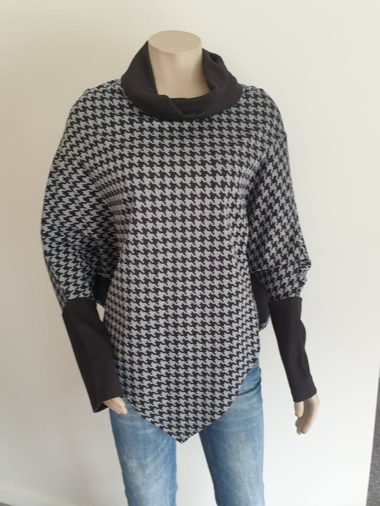 This poncho has a sleeve but is open at the sides and is a Ponte fabric and has a cowl neck.