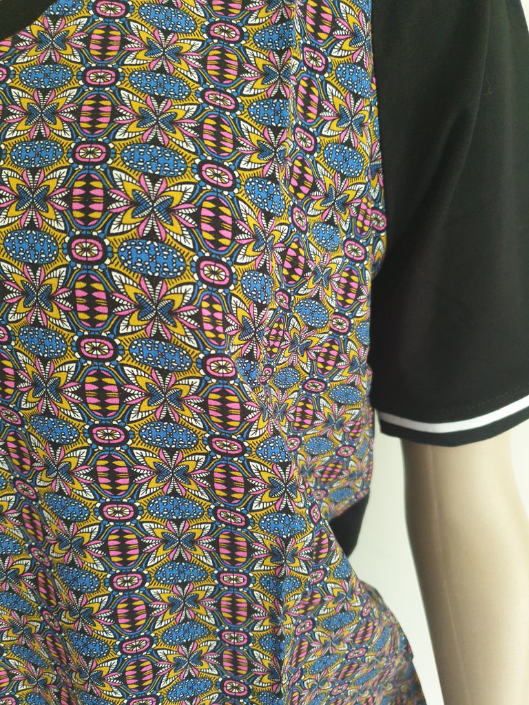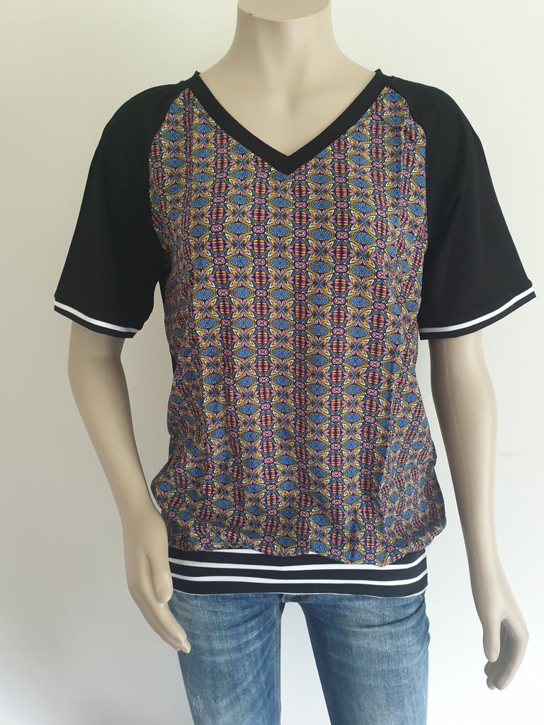 Rayon front , black knit back , stripe knit sleeve , band on the bottom
