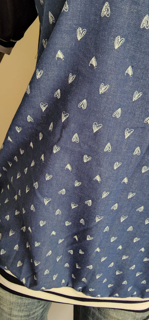 Soft light weight denim front , navy knit back , stripe knit sleeve , band on the bottom