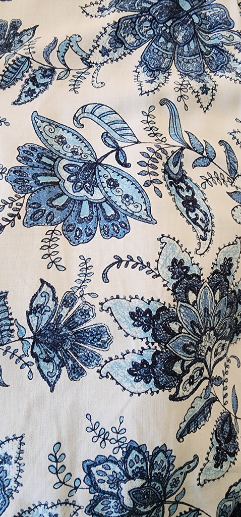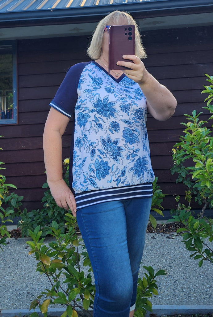 Rayon front , navy knit back , knit sleeve , band on the bottom