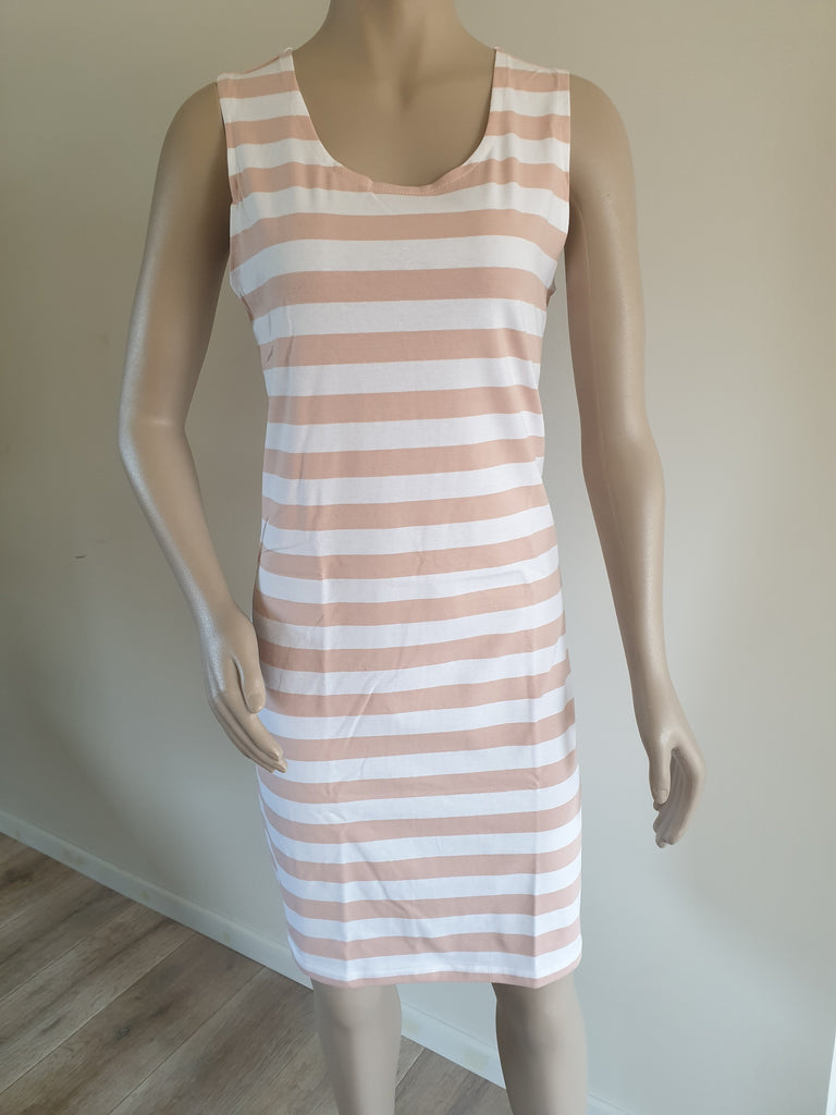 fabric - cotton spandex, this one has matching blush batwing top, generally the stripe dress looks better quite fitted under the top so check measurements but if you intend wearing it on its own then not quite so fitting, there is a bit of stretch in the fabric.