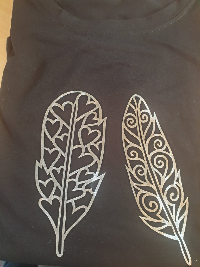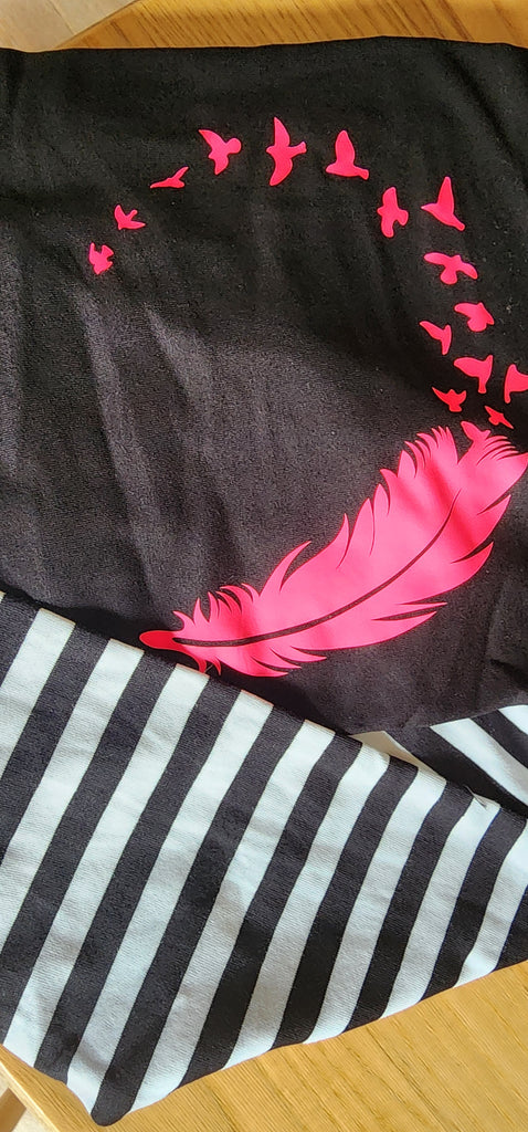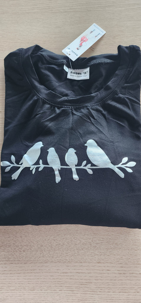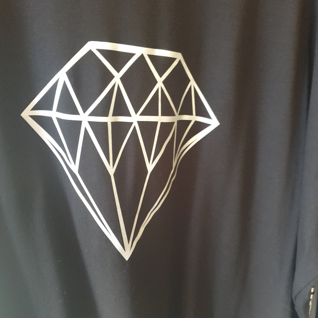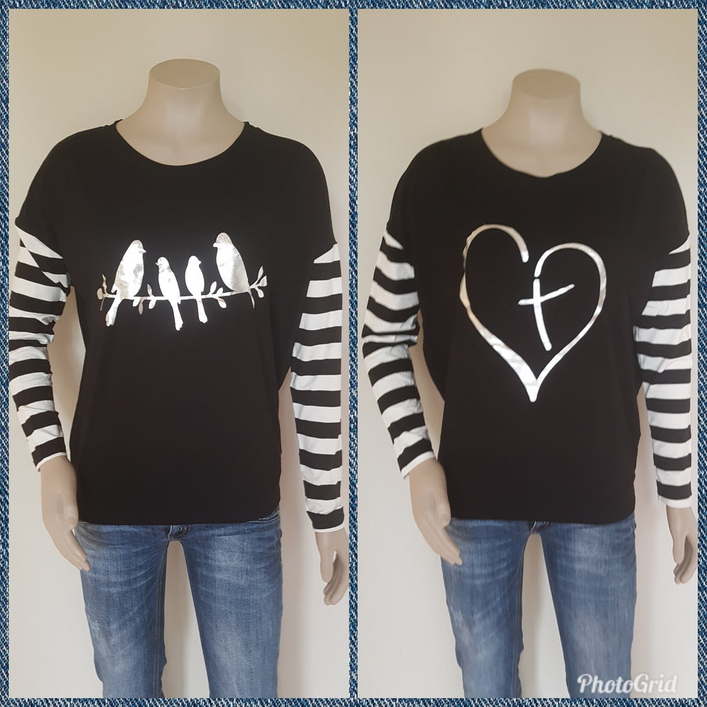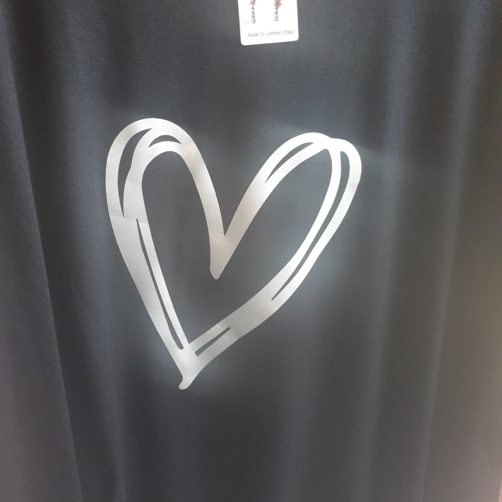 Fabric is Viscose / Spandex and the style in a slouchy fit on bust and tummy , then tapers into the hips. Black with Silver print. Approx Size, these are generous sized.